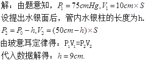 2、计算题 一根长50cm、两端开口的直玻璃管,竖直插入水银槽中,它的上口距水银面10cm。现将管的上口堵住,然后缓慢竖直提出水银面,则管内水银柱的长度为多大?(外界大气压支持75cmHg,温度不变)