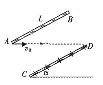 3、计算题 如图所示,两块与水平方向成α角的平行带等量异种电荷的金属板AB与CD,正对放置,板长均为L,有一质量为m、带电量为q的微粒从金属板A端以速度v0沿水平方向进入两板间,并沿直线从金属板D端射出。