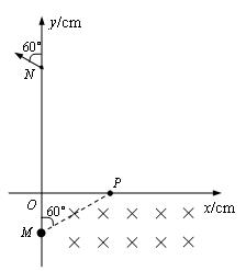 5、计算题 如图所示,第四象限内有互相正交的匀强电场E与匀强磁场B1, E的大小为0.5×103V/m, B1大小为0.5T;第一象限的某个矩形区域内,有方向垂直纸面向里的匀强磁场B2,磁场的下边界与x轴重合.一质量m=1×10-14kg、电荷量q=1×10-10C的带正电微粒以某一速度v沿与y轴正方向60°角从M点沿直线运动,经P点即进入处于第一象限内的磁场B2区域.一段时间后,小球经过y轴上的N点并与y轴正方向成60°角的方向飞出。M点的坐标为(0,-10),N点的坐标为(0,30),不计粒子重力, g取10m/s2.