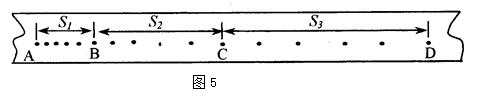 3、填空题 实验“测定匀变速直线运动的加速度”中,打点计时器接50 Hz的交流电源, 振针每隔? s 打一个点,得到的纸带如图5所示,B、C之间的时间为?s,,用刻度尺 测得S1=7.85cm、S2=9.85cm、S3="11.85cm," 则这个做匀变速直线运动的物体的加速度为?m/s2, 物体运动到C时的瞬时速度约为? m/s(保留三位有效数字)。
