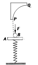 5、计算题 (17分)如图所示,轻质弹簧的一端固定在地面上,另一端与质量为M=1.5Kg的薄木板A相连,质量为m=0.5Kg的小球B放在木板A上,弹簧的劲度系数为k=2000N/m。现有一竖直向下、大小F=20N的力作用在B上且系统处于静止状态,在B球正上方处由一四分之一内壁光滑竖直圆弧轨道,圆弧半径R=0.4m,圆弧下端P点距离距离弹簧原长位置高度为h=0.6m。撤去外力F后,B竖直上升最终从P点切入原轨道,到达Q点的速度为vQ=4m/s。求: