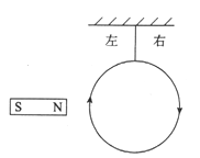 1、选择题  如图所示,用细线悬挂的铝圆环和磁铁在同一竖直平面内,当圆环通入方向如图所示的电流时,圆环将