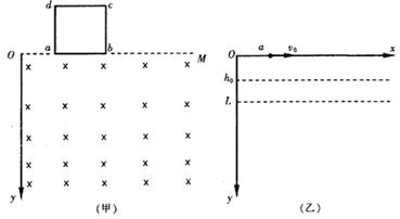3、计算题 16分)如图甲所示,空间存在一垂直纸面向里的水平磁场,磁场上边界OM水平,以O点为坐标原点,OM为x轴,竖直向下为y轴,磁感应强度大小在x方向保持不变、y轴方向按B=ky变化,k为大于零的常数。一质量为m、电阻为R、边长为L的正方形线框abcd从图示位置静止释放,运动过程中线框经络在同一竖直平面内,当线框下降h0(h0<L)高度时达到最大速度,线框cd边进入磁场时开始做匀速运动,重力加速度为g。求: