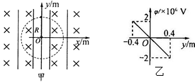 5、选择题 如图甲所示,绝缘轻质细绳一端固定在方向相互垂直的匀强电场和匀强磁场中的O点,另一端连接带正电的小球,小球电荷量,在图示坐标中,电场方向沿竖直方向,坐标原点O的电势为零。当小球以2m/s的速率绕O点在竖直平面内做匀速圆周运动时,细绳上的拉力刚好为零。在小球从最低点运动到最高点的过程中,轨迹上每点的电势