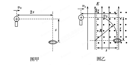 2、实验题 有一个带正电的小球,质量为m,电荷量为q,静止在固定的绝缘支架上.现设法给小球一个瞬时的初速度v0使小球水平飞出,飞出时小球的电荷量没有改变.同一竖直面内,有一个固定放置的圆环(圆环平面保持水平),环的直径略大于小球直径,如图甲所示.空间所有区域分布着竖直方向的匀强电场,垂直纸面的匀强磁场分布在竖直方向的带状区域中,小球从固定的绝缘支架水平飞出后先做匀速直线运动,后做匀速圆周运动,竖直进入圆环.已知固定的绝缘支架与固定放置的圆环之间的水平距离为2s,支架放小球处与圆环之间的竖直距离为s,v0>,小球所受重力不能忽略.求: