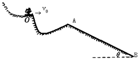 2、计算题 如图,跳台滑雪运动员经过一段加速滑行后从O点水平飞出,经过t1=0.3s落到斜坡上的A点,速度平行于斜坡并刚好沿斜坡下滑。已知A点是斜坡的起点,B点是斜坡的终点,斜坡与水平面的夹角