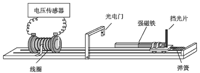 2、实验题 某学习小组的学生利用线圈、强磁铁、光电门传感器、电压传感器等器材,研究“线圈中感应电动势大小与磁通量变化快慢的关系”。在探究线圈感应电动势E与时间△t的关系时,他们把线圈和光电门传感器固定在水平光滑轨道上,强磁铁和挡光片固定在运动的小车上,实验装置如图所示。