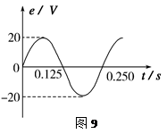 3、选择题 小型交流发电机中,矩形金属线圈在匀强磁场中匀速转动,产生的感应电动势与时间呈正弦函数关系,如图9所示。此线圈与一个R=10Ω的电阻构成闭合电路,不计电路的其他电阻。下列说法正确的是( ?)