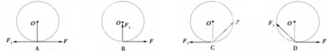 5、选择题  一只小狗拉着雪橇在水平冰面上沿着圆弧形的道路匀速行驶,下图为雪橇受到的牵引力F及摩擦力F1的示意图(O为圆心),其中正确的是(   )