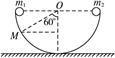 2、选择题 半圆形光滑轨道固定在水平地面上,使其轨道平面与地面垂直,物体m1、m2同时由轨道左、右最高点释放,二者碰后黏在一起向左运动,最高能上升到轨道上M点,如图所示.已知OM与竖直方向夹角为60°,则两物体的质量之比为m1∶m2为(?)