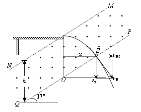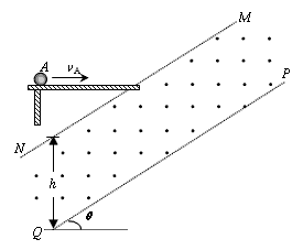 5、计算题 如图所示,光滑的绝缘平台水平固定,在平台右下方有相互平行的两条边界MN与PQ,其竖直距离为h=1.7m,两边界间存在匀强电场和磁感应强度为B=0.9T且方向垂直纸面向外的匀强磁场,MN过平台右端并与水平方向呈θ=37°.在平台左端放一个可视为质点的A球,其质量为mA=0.17kg,电量为q=+0.1C,现给A球不同的水平速度,使其飞出平台后恰好能做匀速圆周运动.g取10m/s2.