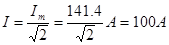 1、选择题 有一正弦交流电,它的电流瞬时值的表达式为i="141.4sin314t" A。那么它的电流有效值是