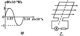 5、计算题 一小型发电机内的矩形线圈在匀强磁场中以恒定的角速度ω绕垂直于磁场方向的固定轴转动,线圈的匝数n=100,穿过线圈的磁通量φ随时间t的变化关系如图甲所示,发电机线圈的电阻r=5Ω,外电路电阻R=95Ω。求串联在外电路中的交流电流表的读数。