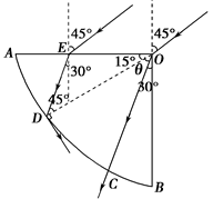 可知光在玻璃柱中发生全反射的临界角C=45°.据折射定律可知所有光线从AO进入玻璃柱后的折射角均为30°.从O点入射后的折射光线将沿半径从C点射出.假设从E点入射的光线经折射后到达D点时刚好