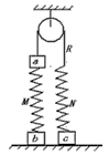 5、选择题 如图所示,a、b、c为三个物块,M、N为两个轻质弹簧,R为跨过光滑定滑轮的轻绳,它们均处于平衡状态。则