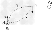 4、选择题  如图所示,实线为一匀强电场的电场线,两个带电粒子q1、q2分别从A、C两点以垂直于电场线方向的初速度射入电场,仅受电场力作用,运动轨迹分别如图中的ABC、CDA所示。已知q1是带正电的粒子。则下列说法中正确的是?