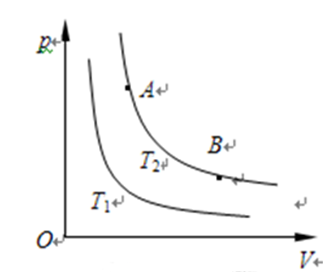 5、选择题 一定质量的理想气体分别在T1、T2温度下发生等温变化,相应的两条等温线如图所示,T2对应的图线上有A、B两点,表示气体的两个状态.则 .