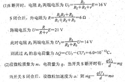 3、计算题 一电路如图所示,电源电动势E=28V,内阻r=2Ω,电阻R1=12Ω,R2=R4=4Ω,R3=8Ω,C为平行板电容器,其电容C=3.0pF,虚线到两极板间距离相等,极板长L=0.20m,两极板的间距d=1.0×10-2m。