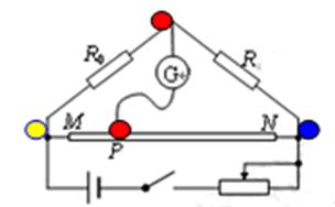 本题解析:当电流表没有电流流过时,如下图,灵敏电流表两端即两个红色的端点之间电压为0即电势相等,那么从正极即黄色的端点到红色端点,一个是