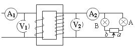 1、选择题 一理想变压器给负载供电,变压器输入电压不变,如图所示。电灯A上标有“10 V,10 W” 的字样,电灯B上标有“8 V,20 W”的字样,滑动变阻器的总电阻为6 Ω,当滑动触头由a端向b端滑动的过程中(不考虑电灯电阻的变化)。则图中所有交流电表的读数及输入功率变化情况正确的是(均为理想电表)(?)