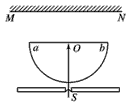 5、选择题 如图所示,MN是位于竖直平面内的光屏,放在水平面上的半圆柱形玻璃砖的平面部分ab与屏平行。由光源S发出的一束白光从半圆沿半径射入玻璃砖,通过圆心O再射到屏上。在水平面内以O点为圆心沿逆时针方向缓缓转动玻璃砖,在光屏上出现了彩色光带。当玻璃砖转动角度大于某一值时,屏上彩色光带中的某种颜色的色光首先消失。有关彩色的排列顺序和最先消失的色光是