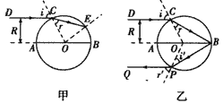 参考答案:解:(1)如图甲所示,DC光线进入介质球内,发生折射,有
