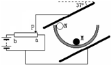 3、填空题 当滑片P从a缓慢滑向b时,处在光滑绝缘的半圆(半径为R)形碗底部 的质量为m的带电小球,从碗底部M缓慢运动至碗口N,在此过程中电场力对小球做了______的功,碗对小球作用力的最小值为______.(平行板与水平方成37°角)