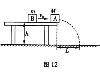 2、计算题 如图12所示质量为M的小物块A静止在离地面高h的水平桌面的边缘,质量为m的小物块B沿桌面向A运动并以速度v0与之发生正碰(碰撞时间极短)。碰后A离开桌面,其落点离出发点的水平距离为L。碰后B反向运动。已知B与桌面的动摩擦因数为μ,重力加速度为g,桌面足够长。求
