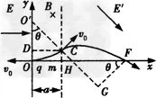(2)粒子进入丙区域后做类平抛运动,由题知其场强方向应沿O"C斜向下,将O"C反向延长交x轴于H,过粒子在丙区域的轨迹与x轴的交点F作O"C反向延长线的垂线得垂足为G,设粒子在丙区域运动的时间为t2