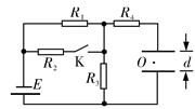 4、计算题 (13分)如图所示的电路中,4个电阻的阻值均为R,E为直流电源电动势,其内阻可以不计,平行板电容器两极板间的距离为d.在平行极板电容器的两个平行极板之间有一个质量为m的带电小球.当电键K闭合时,带电小球静止在两极板间的中点O上.