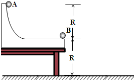 5、简答题 如图所示,固定的光滑的弧形轨道末端水平,固定于水平桌面上,B球静止于轨道的末端.轨道最高点距轨道末端高度及轨道末端距地高度均为R.A球由轨道最高点静止释放,A球质量为2m,B球质量为m,A、B均可视为质点,不计空气阻力及碰撞过程中的机械能的损失.求:A、B两球落地点的水平距离?