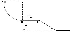2、计算题 如图,半径R=1.0m的四分之一圆弧形光滑轨道竖直放置,圆弧最低点B与长为L=0.5m的水平面BC相切于B点,BC离地面高h=0.45m,C点与一倾角为θ=37°的光滑斜面连接,质量m=1.0kg的小滑块从圆弧上某点由静止释放,已知滑块与水平面间的动摩擦因数μ=0.1。求: