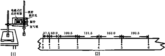 4、简答题 某同学用如图(1)所示装置测重力加速度g,所用交流电频率为50Hz.在所选纸带上取某点为0计数点,以后每隔2个点取一个计数点,用毫米刻度尺测量的数据(单位:mm)如图(2)所示.若相邻两计数点时间间隔