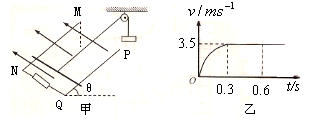 4、计算题  如图甲所示,一足够长阻值不计的光滑平行金属导轨MN、PQ之间的距离L=1.0m,NQ两端连接阻值R=3.0Ω的电阻,磁感应强度为B的匀强磁场垂直于导轨所在平面向上,导轨平面与水平面间的夹角θ=300。一质量m=0.20kg,阻值r=0.50Ω的金属棒垂直于导轨放置并用绝缘细线通过光滑的定滑轮与质量M=0.60kg的重物相连。细线与金属导轨平行。金属棒沿导轨向上滑行的速度v与时间t之间的关系如图乙所示,已知金属棒在0~0.3s内通过的电量是0.3~0.6s内通过电量的1/3,g=10m/s2,求: