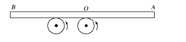 2、计算题 如图所示,两轮在同一高度,它们的半径均为R="0.2" m,均以角速度ω="8" rad/s绕过轮心的水平轴逆时针转动,两轮心间的距离s="1" m,一块长为l(l>2 m)的均匀木板AB,水平无初速度地放在两轮上,且木板重心O恰好在右轮轮心正上方.木板与两轮边缘的动摩擦因数均为μ=0.2.