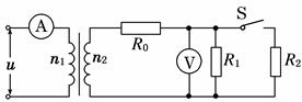 5、选择题 如图所示,理想变压器原线圈的匝数n1=1100匝,副线圈的匝数n2=110匝,R0、R1、R2均为定值电阻,且R0=R1=R2,电流表、电压表均为理想电表.原线圈接u=220