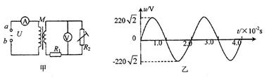1、选择题 如图甲所示,M是一个小型理想变压器,原副线圈匝数之比
