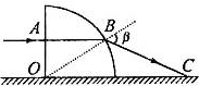 球体放置在水平面上,一束蓝光从A点沿水平方向射入球体后经B点射出,最后射到水平面上的C点。已知