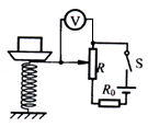 1、计算题  (10分)在科技活动中某同学利用自制的 电子秤来称量物体的质量,其原理如图所示,托盘和弹簧的质量均不计。变阻器的滑动端与弹簧上端连接(但与弹簧间不通电),当托盘中没有放物体时,滑动变阻器的滑动触头正好在变阻器的最上端;设变阻器的总电阻为R,总长度为 L,电源电动势为E,内阻为r,限流电阻的阻值为R0,弹簧劲度系数为k,不计一切摩擦和其他阻力,电压表为理想电压表。