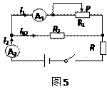 3、选择题  如图5所示电路中,电源内阻不计,电压保持不变,当滑动变阻器的滑片P向右移动时,电流表A1和A2的变化量分别为 和