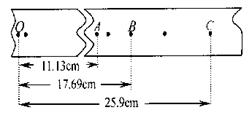 (3)选出一条纸带如图所示,其中O点为起点,A、B、C为三个计数点,打点计时器打点周期为0.02s,用最小刻度为mm的刻度尺,测得OA=11.13cm,OB=17.69cm,OC=25.9cm。这三个数字中不符合有效数字要求的是?,重锤的质量为m=0.2kg,根据以上数据,求当打点针打到B点时重锤的重力势能比开始下落时减少了?J;这时它的动能增加量是?J。(g取10m/s2,结果保留三位有效数字)