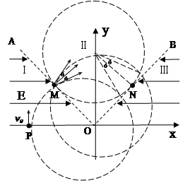 3、计算题 (16分)如图所示为某一仪器的部分原理示意图,虚线OA、OB关于y轴对称,, OA、OB将xOy平面分为Ⅰ、Ⅱ、Ⅲ三个区域,区域Ⅰ、Ⅲ内存在水平方向的匀强电场,电场强度大小相等、方向相反。带电粒子自x轴上的粒子源P处以速度v0沿y轴正方向射出,经时间t到达OA上的M点,且此时速度与OA垂直。已知M到原点O的距离OM = a,不计粒子的重力。求: