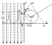 3、计算题 如图所示,质量为m,带电量为q(q>0)的粒子(重力不计),从离坐标原点为1.5a的 y轴上的P点,以速度大小为v0,方向与y轴正方向成θ=30°射入xoy坐标的第一象限,经过一个在第一象限内,边界形状为等腰梯形方向与xoy坐标面垂直匀强磁场区域,然后沿-x方向经过坐标原点0,进入相互垂直的匀强电场和匀强磁场中,其运动轨迹为虚线所示,该电场强度为E,方向沿-y轴方向,磁感应强度为B,方向垂直坐标面向外。