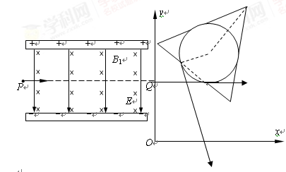 5、计算题 (19分)如图所示的平行板器件中,存在相互垂直的匀强磁场和匀强电场,磁场的磁感应强度B1 =" 0.40" T,方向垂直纸面向里,电场强度E = 2.0×105 V/m,PQ为板间中线.紧靠平行板右侧边缘xOy坐标系的第一象限内,有垂直纸面的正三角形匀强磁场区域(图中未画出),磁感应强度B2 =" 0.25" T。一束带电量q = 8.0×10-19 C,质量m = 8.0×10-26 kg的正离子从P点射入平行板间,不计重力,沿中线PQ做直线运动,穿出平行板后从y轴上坐标为(0,0.2m)的Q点垂直y轴射向三角形磁场区,离子通过x轴时的速度方向与x轴正方向夹角为60°。则:
