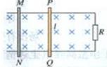 3、计算题  如图所示,匀强磁场的磁感应强度B=1T,平行导轨宽l=1m。两根相同的金属杆MN、PQ在外力作用下均以v=1m/s的速度贴着导轨向左匀速运动,金属杆电阻为r="0.5" ?。导轨右端所接电阻R=1?,导轨电阻不计。(已知n个相同电源的并联,等效电动势等于任意一个电源的电动势,等效内阻等于任意一个电源内阻的n分之一)