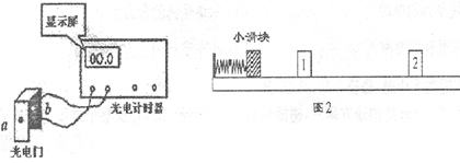1、填空题 光电计时器是一种研究物体运动情况的常用计时仪器,其结构如图1所示,当有物体从a、b间通过时,光电计时器就可以显示物体的挡光时间。利用如图2所示装置测量滑块在导轨上滑行的加速度。图中导轨左侧固定有一个处于锁定状态的压缩轻弹簧(弹簧长度与导轨相比可忽略),弹簧右端与滑块接触,1和2是固定在导轨上适当位置的两个光电门,与之连接的两个光电计时器没有画出。现使弹簧解除锁定,滑块获得一定的初速度后,水平向右运动。光电门1、2各自连接的计时器显示的挡光时间分别为和