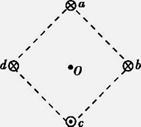 1、选择题 图中a、b、c、d为四根与纸面垂直的长直导线,其横截面位于正方形的四个顶点上,导线中通有大小相同的电流,方向如图所示。正方形中心O点的磁场方向是( )