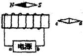 本题解析:小磁针静止时N极所指方向为该点磁场方向,由此可知通电螺线管右侧为N极,由右手螺旋定则可知电源的a端为负极,右侧小磁针被磁化后d端为N极,D对;