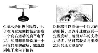 本题解析:通电导线的周围有磁场,处在磁场中的小磁针要受到磁场力作用,若A图中导线有电流,小磁针要发生偏转,图景与实际不符,A项错误;B图中开关闭合,线圈中磁通量变化,产生感应电流,导致电流表的指针偏转;C图中电子在磁场中受到磁场力作用,用左手定则判断电子束将向下偏转;D图中汽车速度达到第一宇宙速度时,汽车环绕地球近地做圆周运动,处在车内的物体处于完全失重状态.