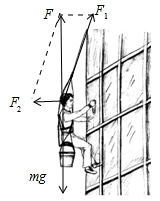 2、选择题  如图所示,清洗楼房光滑玻璃的工人常用一根绳索将自己悬在空中,工人及其装备的总重量为G。悬绳与竖直墙壁的夹角为α,悬绳对工人的拉力大小为F1,墙壁对工人的弹力大小为F2 , 则: